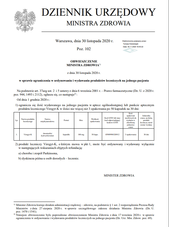 W związku z obwieszczeniem z dnia 30 listopada 2020 Ministra Zdrowia o nakazie ordynowania leku chlorowodorku amantadyny (może być jedynie ordynowany w: a) choroba i zespół Parkinsona, b) dyskineza późna u osób dorosłych – leczenie), które weszło w życie 1 grudnia, informujemy, że: