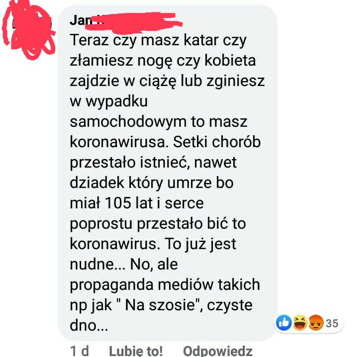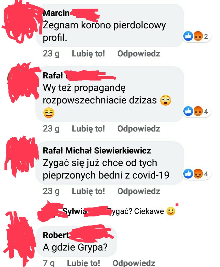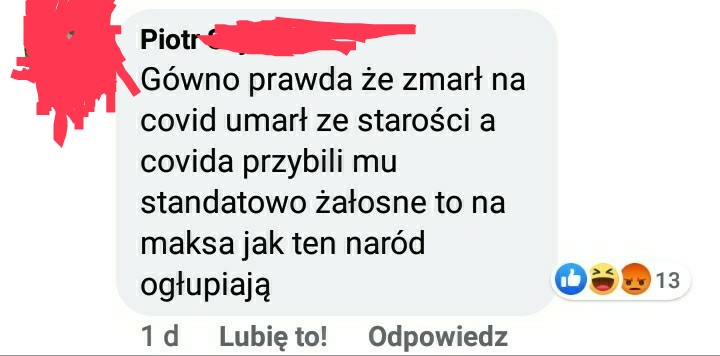 Internauci: Przestańcie nas straszyć! Chcecie, żeby wszyscy się bali, żeby dalej odbierali nasze podstawowe prawa! A nie możemy przecież już dłużej żyć bez Starbunia, galerii handlowych, McDonalda! Ludzie, jaki Covid?! Przecież młode, zdrowe osoby nie umierają na Covid! Umierają tylko Ci starsi i schorowani. A skoro ten umarł, to na pewno miał jakieś ukryte choroby współistniejące! A mógł nawet o tym nie wiedzieć! Wprawdzie nie wierzymy w “choroby bezobjawowe”, ale są takie choroby, które można mieć, a nawet nie wiemy, że na nie chorujemy! A co? Mało to ludzi umiera dzisiaj w młodym wieku?! I jakoś nie robią z tego sensacji. A poza tym, niech ujawnią coś więcej. Czy ten pan przypadkiem nie pił, nie palił i nie brał narkotyków? Menele szybko się przekręcają. Aaa policjantem był? No to dobrze, że zdechł, należało mu się, za to że bił prawdziwych patriotów/kobiety (tu w zależności od sympatii politycznych: niepotrzebne skreślić) na demonstracjach, których ta faszystowska władza zabrania! A co w nich złego? Przecież profesor Simon powiedział, że na takich marszach nie ma żadnego zagrożenia epidemicznego… Zajmijcie się wreszcie chorymi na raka i o nich zacznijcie mówić!