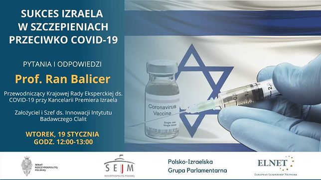 Przewodniczący krajowej rady eksperckiej ds. COVID-19 przy premierze Izraela, prof. Ran Balicer, ma spotkać się z polskimi politykami w Senacie. Opowie im o izraelskim sukcesie akcji wyszczepiania obywateli. Spotkanie jest organizowane przez przedstawicieli Polsko-Izraelskiej Grupy Parlamentarnej.