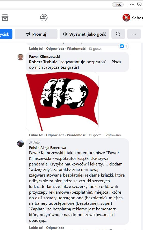 Szkoda, że Pan Klimczewski w swoim zadufaniu nie zauważył, że wszystkie banery, które były rozwieszone przez Polską Akcję Banerową, a które reklamowały jego książkę podarowali “za darmo” ludzie dobrej woli, “za darmo” dostaliśmy na pół roku przyczepę na której można było powiesić dwa banery, “za darmo” dostaliśmy miejsce pod przyczepę, “za darmo” Pan z Nowego Sącza wydrukował nam 30 banerów…wielu wspaniałych ludzi zupełnie “za darmo” powiesiło banery na swoich płotach, domach i innych miejscach. Nawet nie “za darmo”, bo każdy z nich pokrył jeszcze koszty wydruku. Tych wiele “za darmo” było jeszcze trochę…na końcu dodając, że swoją pracę też daliśmy “za darmo” i w każdej chwili możemy rozliczyć się z każdej zrzutki.
