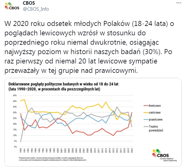 Korzystając z okazji doprecyzuję, że w głębszym rozumieniu prawość i lewicowość są kategoriami etycznymi zakorzenionymi w duchowości. W rzeczywistości sytuacja jest gorsza niż na wykresie. Osoby “lewicowe”, “centrowe” oraz “trudno powiedzieć”, co jest dobre, a co złe, tworzą zbiorowisko niewolników w stanie anomii – dezorientacji moralnej, a więc w stanie zwiększonej podatności na każdą antykulturową używkę. Dodać należy, że samoidentyfikacja pewnej części osób biorących udział w badaniu może być błędna, a poglądy polityczne nie zawsze odpowiadają poglądom moralnym.