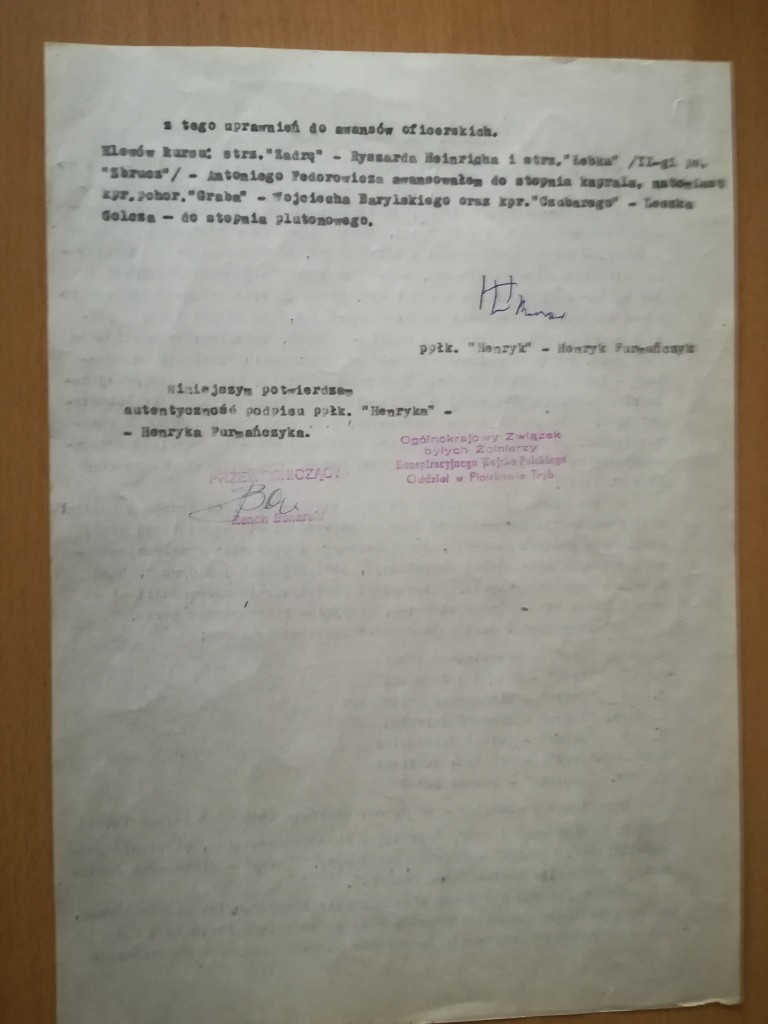 i Poświadczenie Ukończenia Kursu Podchorążych wystawione przez prowadzącego kurs płk. Henryka Furmańczyka ps. „Henryk”.