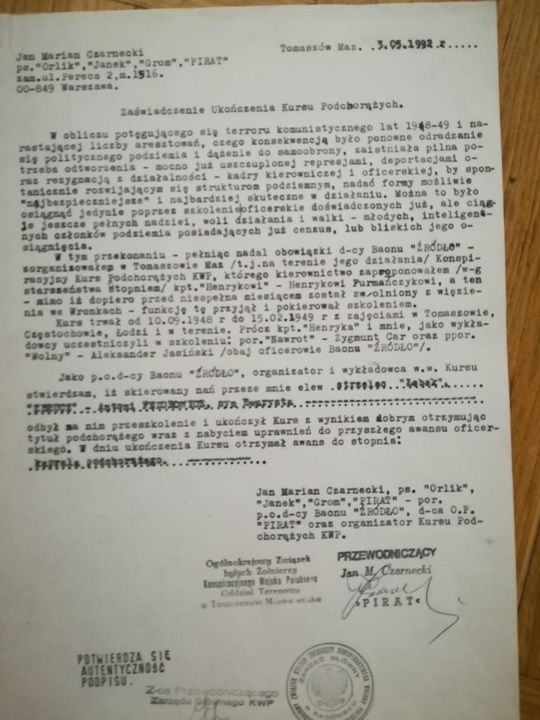 Zaświadczenie Ukończenia Kursu Podchorążych, podpisane przez organizatora i wykładowcę kursu, por. Jana Mariana Czarneckiego pseudonimy. „Orlik”, „Janek”, „Grom”, „Pirat”.