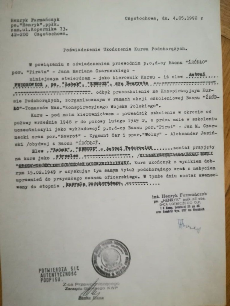 „…W powiązaniu z oświadczeniem przewodnim p.o.d-cy Baonu „ŹRÓDŁO” por. „Pirata” – Jana Mariana Czarneckiego – niniejszym stwierdzam – jako kierownik Kursu – iż elew Antoni FEDOROWICZ, PS. „Łebek”, „ZBRUCZ”, syn Ewarysta, odbył przeszkolenie na Konspiracyjnym Kursie Podchorążych w ramach akcji szkoleniowej Baonu „Źródło” – Tomaszów Maz. „Konspiracyjnego Wojska Polskiego”.