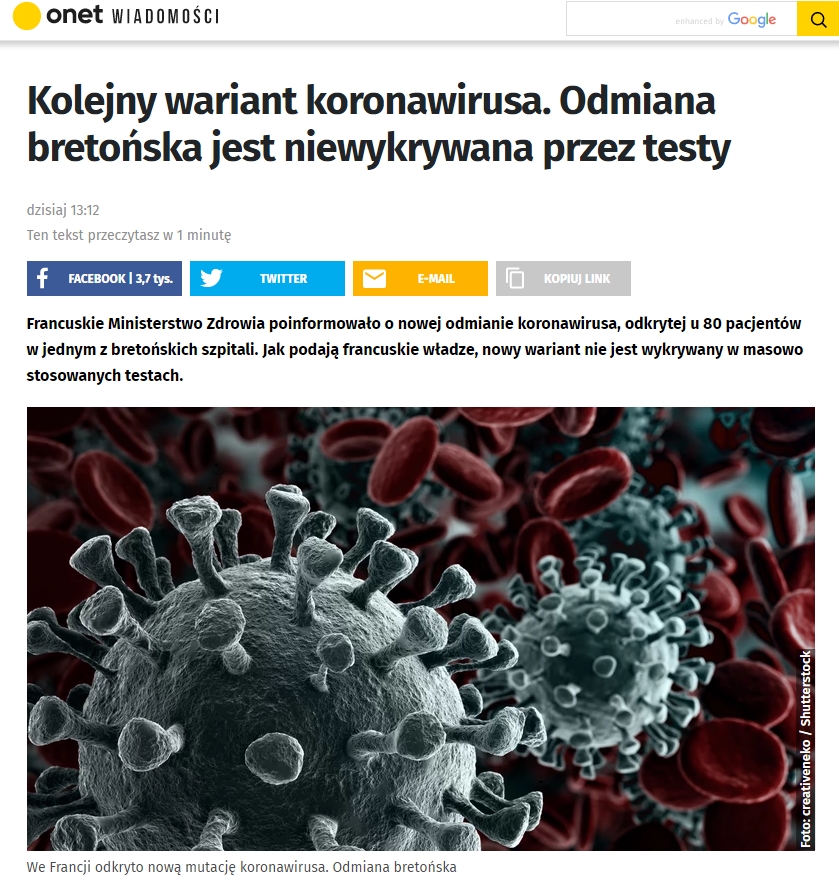 Francuskie Ministerstwo Zdrowia poinformowało o nowej odmianie koronawirusa, odkrytej u 80 pacjentów w jednym z bretońskich szpitali. Jak podają francuskie władze, nowy wariant nie jest wykrywany w masowo stosowanych testach.