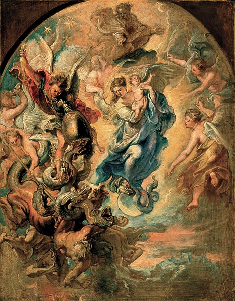 Myronie, nie znajduję słów by Ci podziękować za to zacytowane przez Ciebie proroctwo. Nie znałem go wcześniej, a jakbym słowo w słowo czytał o czasach, które nadeszły. Także i ja z zasmuceniem konstatuję, jak niewielu zdaje sobie dziś sprawę z “ciężaru gatunkowego wydarzeń, bliskich jak wyciągnięcie ręki”. Wydarzeń będących, jak piszesz, “na głównej osi Zbawienia”. Jak wiele teraz od nas zależy, bo Bóg nas postawił obok aniołów, byśmy razem z nimi walczyli. W tym kontekście – olbrzymiego zadania, jakie Niebiosa stawiają teraz przed nami, rycerzami Nowego Nieba i Nowej Ziemi, które nadchodzą zgodnie z Bożym Planem – cała ta wściekła, wrzeszcząca “załóż maskę!” hałastra jest jak na tym obrazie: kłębowisko rąk, nóg, gardzieli, masa diabelska odtrącana przez stopę Maryi i szyta dzidami jej zastępów. Bóg zapłać za ten błogosławiony komentarz i za wysoki ton.