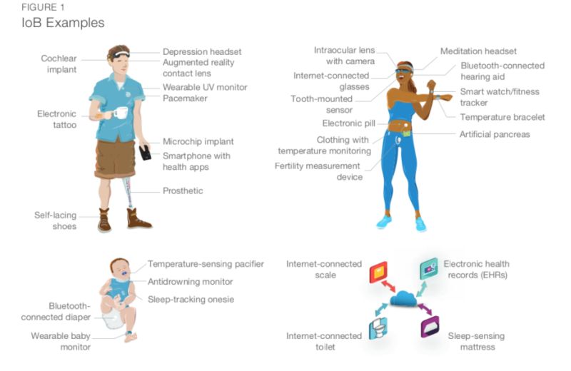 Urządzenia IoT, takie jak inteligentne liczniki, inteligentne zegarki, wirtualni asystenci i samojezdne samochody, łączą się bezpośrednio z Internetem lub przez sieć lokalną. Ponieważ urządzenia IoT stają się coraz bardziej powszechne, eksperci przewidują, że wzrośnie również akceptacja i chęć korzystania z urządzeń IoB. Raport RAND przewiduje: