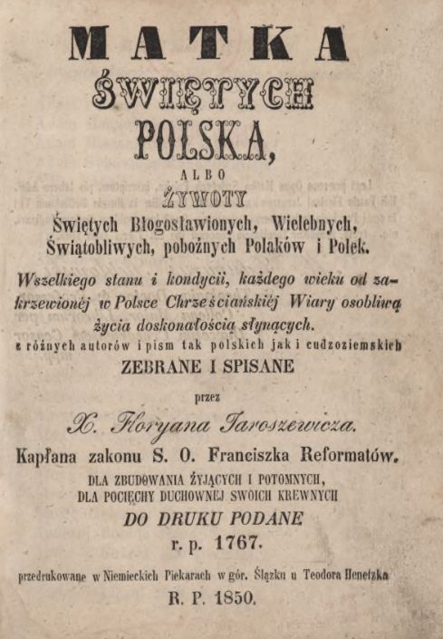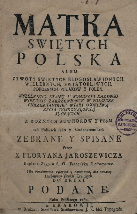 W roku 1767 ojciec Florian Jaroszewicz z zakonu franciszkanów-reformatów wydał w Krakowie książkę pod wielce znamiennym tytułem Matka Świętych Polska. Było to niemal dokładnie 800 lat po Chrzcie Mieszka I. Książka o. Jaroszewicza zawierała życiorysy prawie 400 osób świętych lub uznawanych za święte (przynajmniej jednej na każdy dzień roku), które w tych ośmiu wiekach pojawiły się na polskiej ziemi.