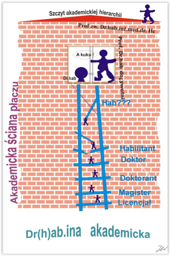 Kto po takiej drabinie chce się piąć w górę, może natrafić na podpiłowane czy wręcz roztrzaskane szczeble, a i na głowę coś mu może spaść, a może i sama głowa. Istna akademicka ściana płaczu, zwieńczona beneficjentami systemu tytularnego broniącymi swoich wysoko umocowanych siedlisk.