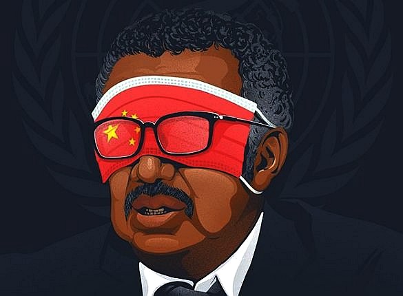 Amerykańska karykatura Tedrosa Adhanom Ghebreyesusa – marksisty i niebędącego lekarzem dyrektora generalnego WHO
