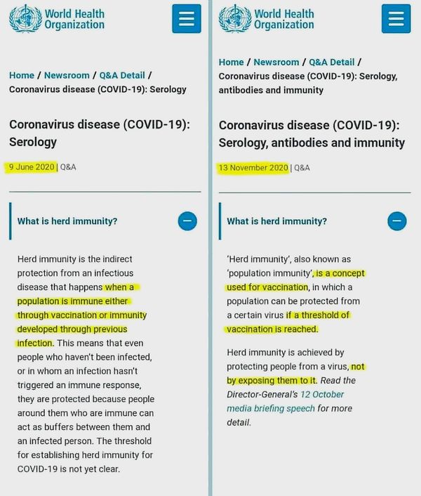Wcześniej obowiązywała opublikowana na stronie WHO w dniu 9 czerwca 2020 r. następująca definicja: Odporność zbiorowa, to pośrednia ochrona przed chorobą zakaźną, która ma miejsce, gdy populacja osiąga odporność albo przez szczepienie, albo przez naturalną odporność rozwiniętą w wyniku wcześniejszej infekcji.
