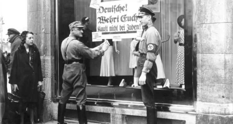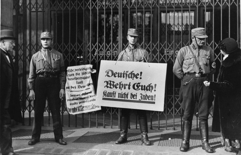 1 kwietnia 1933 r., wkrótce po mianowaniu Hitlera kanclerzem, naziści zorganizowali bojkot żydowskich przedsiębiorstw w Niemczech. Członkowie Szturmowców („die Sturmabteilung” lub „Departament Burzy”, jak lubię o nich myśleć) stali przed żydowskimi sklepami z gotyckimi afiszami z napisem „Niemcy! Brońcie się! Nie kupujcie od Żydów!”