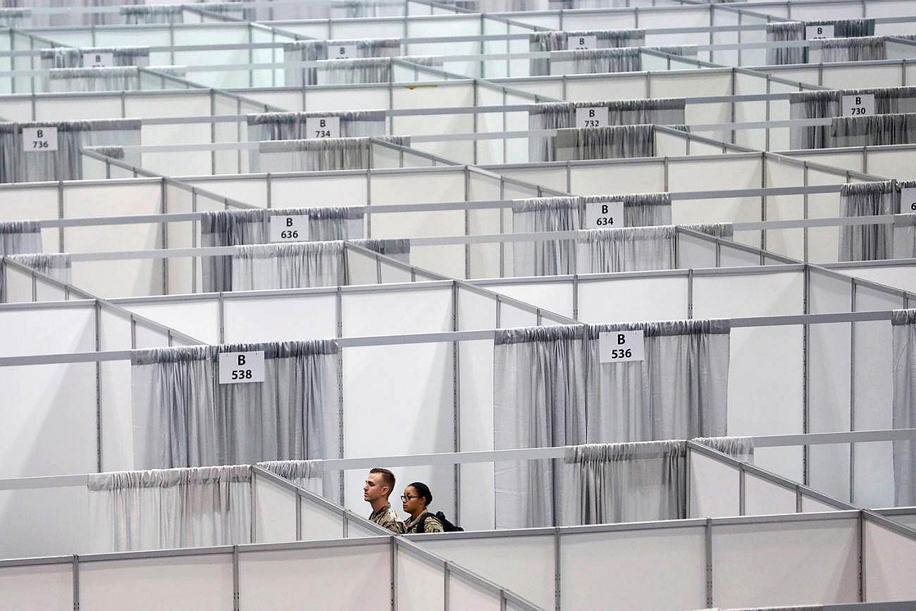 Patrol sprawdza boksy medyczne przygotowane do obsługi mieszkańców Manhattanu, Nowy Jork 2020