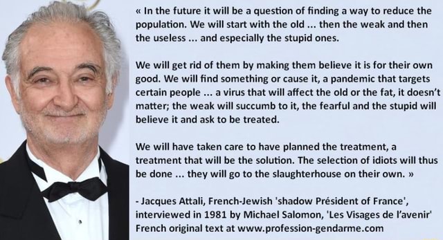 Ma Pan absolutną rację. Attali mówi otwartym tekstem, co autorzy zaplanowanej rozprawy z ludzkością mówią między sobą o tejże ludzkości. Że głupcy, barany, grubasy, sami lezą na rzeź. I tak obecnie jest, sami to co dzień widzimy.