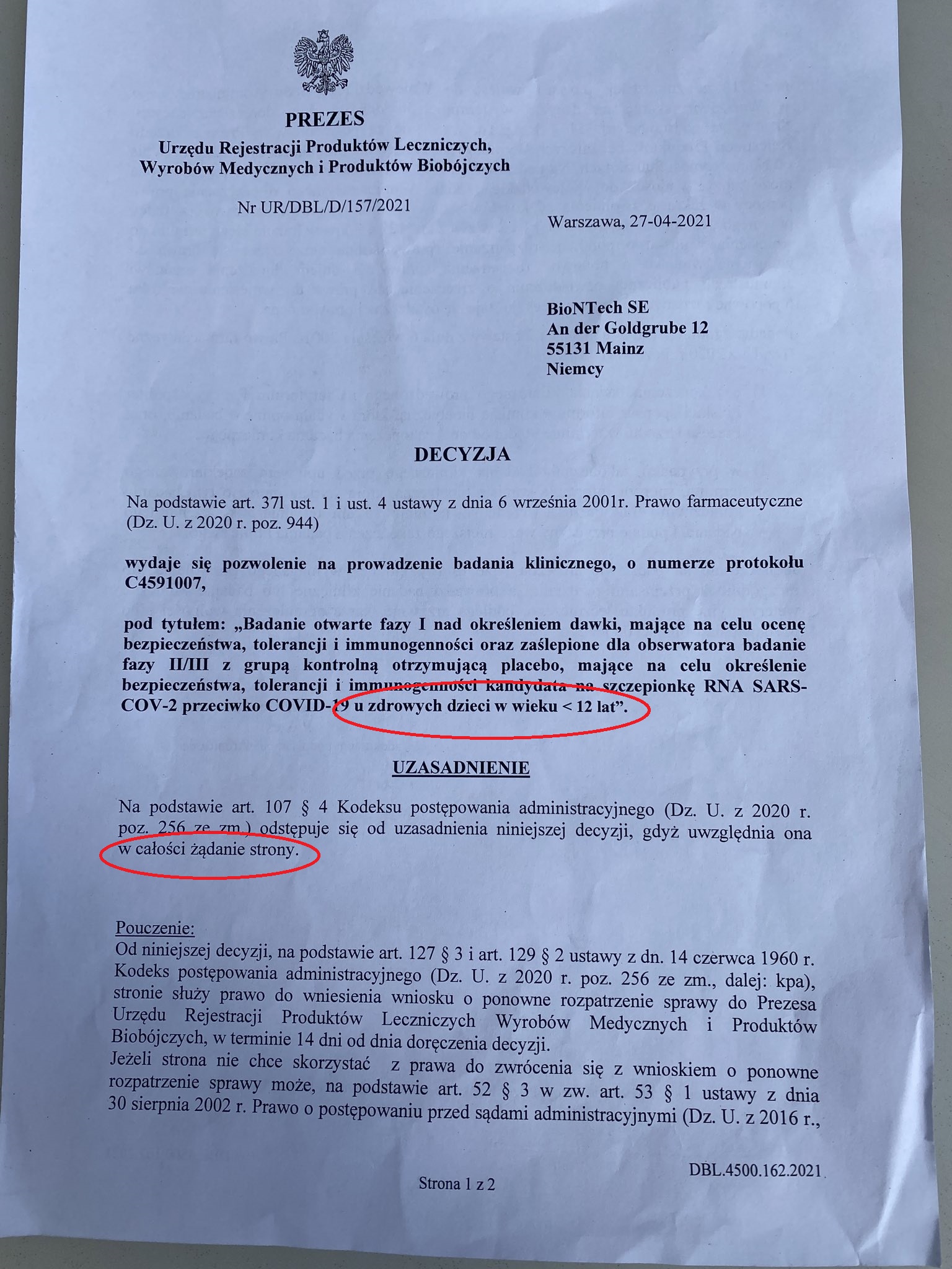 W wyniku kontroli poselskiej poseł Braun dotarł do dokumentu, z którego wynika, że już w kwietniu prezes Cessak wydał zgodę koncernowi Pfizer na testowanie szczepionek przeciw COVID-19 na zdrowych dzieciach poniżej 12. roku życia.