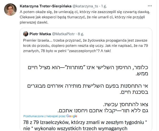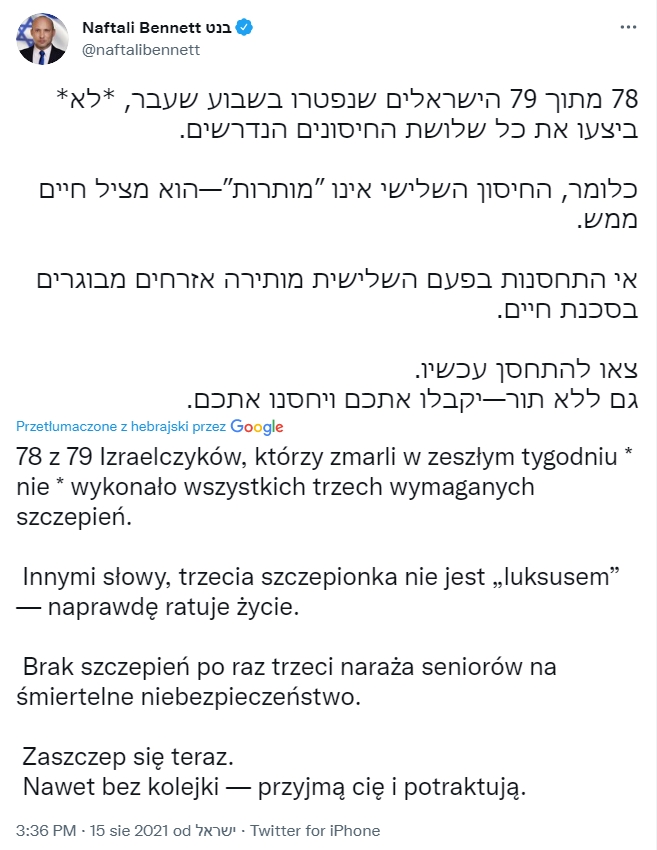 Czy wzrost zachorowań potwierdzony oficjalnymi komunikatami o konieczności brania trzeciej dawki szczepionki covidowej świadczy o nieskuteczności dwóch poprzednich dawek? Naftali Bennet, premier Izraela najbardziej wyszczepionego kraju ujął to w ten sposób: