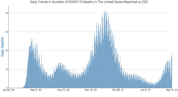 Jak wcześniej donosił National File, czwarta fala pandemii COVID-19 w USA wydaje się być prawie dwa razy bardziej śmiertelna niż druga fala, która miała miejsce na kilka miesięcy przed tym jak setki milionów ludzi otrzymały szczepienia przeciwko koronawirusowi. Według danych CDC śmiertelność koronawirusa w USA w ciągu pierwszych dziesięciu dni września 2021r. jest prawie dwukrotnie wyższa niż w pierwszych dziesięciu dniach września 2020r.