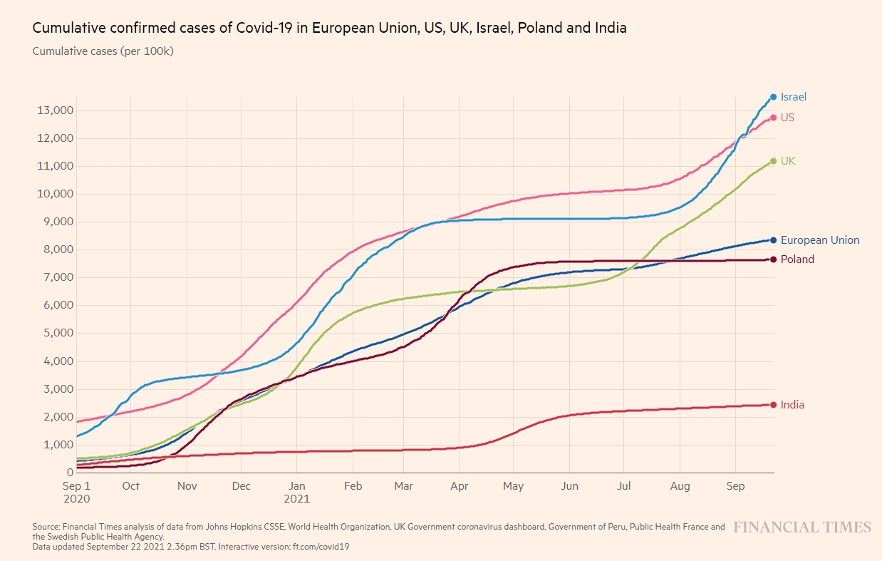 Na poniższych wykresach widać wyraźnie dynamikę zachorowań u osób zaszczepionych. Widać także, że największa liczba zakażeń jest w krajach najbardziej “wyszczepionych” /Polska w kolorze zielonym/.