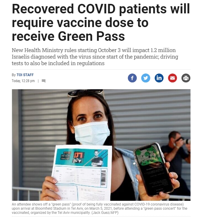 Ministerstwo Zdrowia Izraela ogłosiło, że od 3 października zostanie wprowadzony szereg nowych ograniczeń. Ozdrowieńcy z naturalną odpornością po przechorowaniu “COVID-19”, aby nie znaleźć się w getcie, będą musieli zgodzić się na jedną dawkę preparatu covidowego. Zostaną w ten sposób włączeni do systemu kontroli. Po spełnieniu tego warunku otrzymają “Zieloną Przepustkę”.