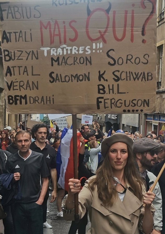 33 letnia “Kasandra” Cassandre Fristot nie przepowiadała przyszłości. 7 sierpnia brała udział w demonstracji przeciwko przepustkom covidowym, niosąc plakat z nazwiskami osób, które określiła mianem “zdrajców”. Transparent został zauważony przez środowiska specjalizujące się w “mowie nienawiści” i biegłych w stygmatyzowaniu swoich przeciwników politycznych. Francuzka została oskarżona o antysemityzm, a konkretnie o podżeganie do nienawiści rasowej. Na plakacie były wymienione osoby publiczne różnej narodowości, w tym żydowskiej, zaangażowane w pandemię na poziomie kreacji i zarządzania. Listę otwierało nazwisko Rotschild, a prócz tego byli m.in. Attali, Soros i Schwab.