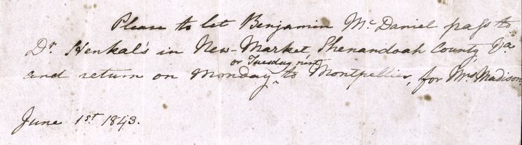 Przepustka niewolnika dla Benjamina McDaniela na podróż z Montpellier do New Market w hrabstwie Shenandoah w stanie Wirginia, 1 czerwca 1843 r. /Slave pass for Benjamin McDaniel to travel from Montpellier to New Market, Shenandoah County, Virginia, June 1, 1843/Digital Public Library of America/