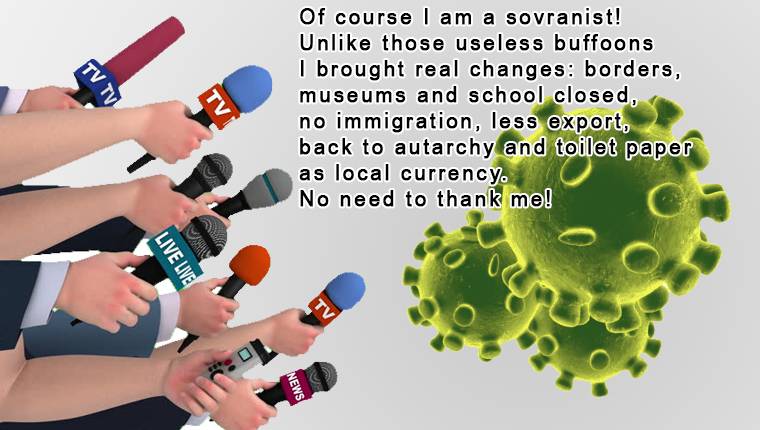 “Oczywiście, że jestem sowranistą! W przeciwieństwie do tych bezużytecznych bufonów spowodowałem prawdziwe zmiany: granice, muzea i szkoły zamknięte, żadnej imigracji, mniejszy eksport, powrót do autarchii i papieru toaletowego jako lokalnej waluty. Nie musicie dziękować!”