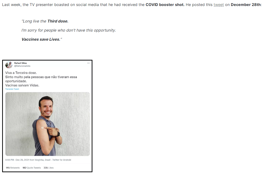 Oto brazylijski prezenter TV Rafael Silva 28 grudnia przyjął trzecią dawkę “szczepionki” czym nie omieszkał się pochwalić w “mediach społecznościowych”. Wie gdzie leżą konfitury i zapewnia o swoim oddaniu. Szczepionki bowiem “ratują życie”.