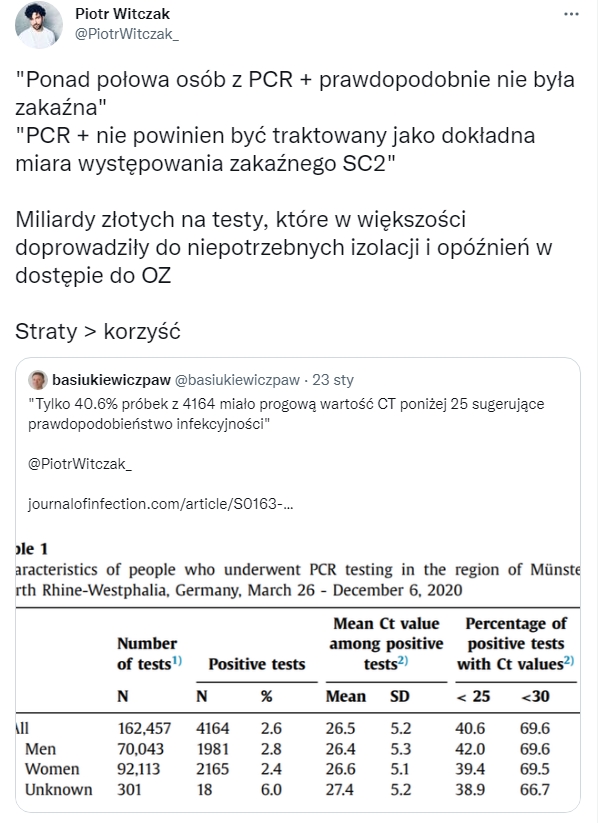 Czlowiek,ktory nie ma objawow chrobowych jest zdrowy i nikogo nie moze zarazic. Zdrowi ludzie nie potrzebuja udowadniac,ze sa zdrowi przy pomocy testow ,ktore sa watpliwe . Czlowiek,ktory ma objawy chorobowe nie potrzebuje testu tylko wlasciwe leczenie.Oslawiony wirus SarsCov 2 nigdy nie zostal wyizolowany,wiec test PCR wlasciwie stwierdza nie wiadomo co.