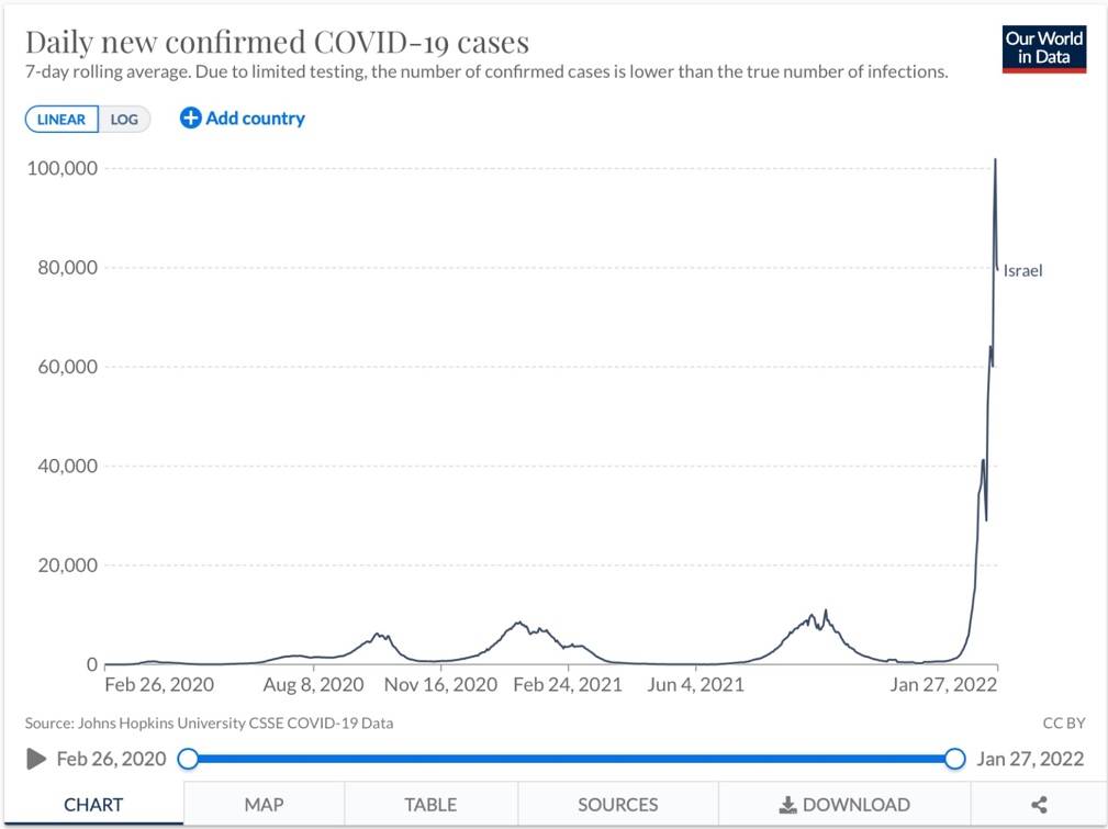 Mimo że ludność Izraela jest w dużym procencie zaszczepiona i po dawce przypominającej [boostered], w kraju pojawia się bezprecedensowa liczba przypadków. 25 stycznia Izrael zgłosił ponad 101 905 przypadków, czyli ponad 10 razy więcej niż przed szczepieniem. Innymi słowy, teraz, gdy Izraelczykom wstrzyknięto masowo szczepionki mRNA, liczba przypadków u nich wzrosła o ponad 1000 procent.
