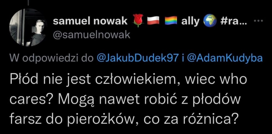 Wykładowca i rzecznik Instytutu Psychologii Uniwersytetu Jagiellońskiego Samuel Nowak, związany z lewicową partią Razem, w okrutny i dehumanizujący sposób szydzi z dzieci nienarodzonych, pisząc, że z płodów można robić nawet farsz do pierożków.