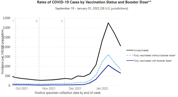 CDC twierdzi, że niezaszczepieni dorośli mieli 2,6 razy większe prawdopodobieństwo pozytywnego wyniku testu na COVID-19 w styczniu w porównaniu z w pełni zaszczepionymi dorosłymi i 3,2 razy większe prawdopodobieństwo w porównaniu z dorosłymi po boosterze oraz co najmniej 30 razy większe prawdopodobieństwo hospitalizacji w grudniu 2021r. z powodu COVID-19 w porównaniu do Amerykanów po boosterze w wieku 18 lat lub starszych, 14 razy większe prawdopodobieństwo zgonu z powodu COVID-19 w grudniu 2021r. w porównaniu z osobami w pełni zaszczepionymi i 41 razy większe prawdopodobieństwo zgonu na COVID-19 w grudniu 2021r. w porównaniu do osób po boosterze.