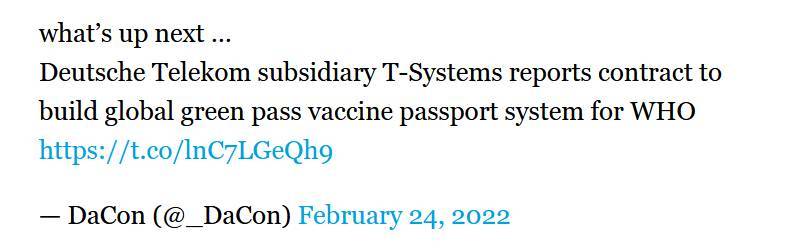 Spółka zależna Deutsche Telekom, T-Systems, informuje o kontrakcie na budowę globalnego systemu paszportów szczepień dla WHO https://t.co/lnC7LGeQh9— DaCon (@_DaCon) 24 lutego 2022 r.