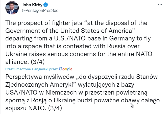 Pentagon odrzuca ofertę Polski: „USA dążyły do przyspieszenia dostaw broni na Ukrainę. Ale perspektywa lotu samolotami bojowymi z terytorium NATO do strefy wojny budzi poważne obawy dla całego sojuszu NATO. „nie jest dla nas jasne, że istnieje racjonalne uzasadnienie tego”