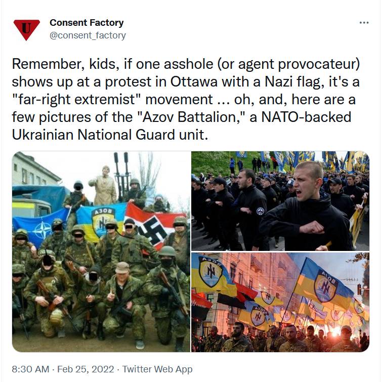 OK, pierwszą rzeczą, na którą musimy spojrzeć, odrzucić, zaprzeczyć i udawać, że nigdy się o niej nie dowiedzieliśmy, jest ten nonsens dotyczący „ukraińskich nazistów”. Tylko dlatego, że Ukraina jest pełna neonazistów, a niedawni członkowie jej rządu byli neonazistami, a jej wojsko ma oddziały neonazistowskie (np. osławiony Batalion Azow) i ma święto narodowe celebrujące nazistę, a rządowi urzędnicy wieszają jego portret w swoich biurach, a wojsko i neonazistowskie milicje terroryzują i mordują etnicznych Rosjan od czasu, gdy USA i Siły Dobra wsparły i zorganizowały „rewolucję” (tj. zamach stanu) w 2014r. z pomocą wielu neonazistów… to nie znaczy, że Ukraina ma „problem nazistowski”. W końcu jej obecny prezydent jest Żydem!