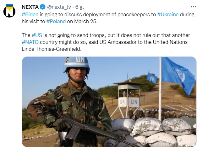 “Wcześniej też polską propozycję misji pokojowej odrzuciło NATO. Sekretarz generalny Jens Stoltenberg co prawda zapewnił, że państwa sojusznicze są gotowe udzielić wszelkiego niezbędnego wsparcia Ukrainie, lecz stwierdził także, że sojusznicy są także zgodni co do tego, iż NATO nie powinno przemieszczać swoich sił ani na lądowe terytorium Ukrainy, ani w jej przestrzeń powietrzną”.