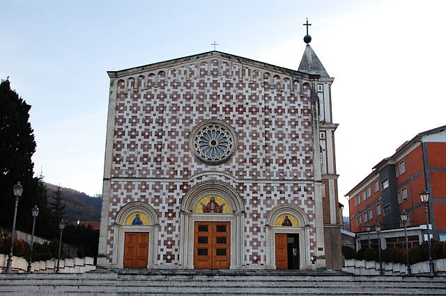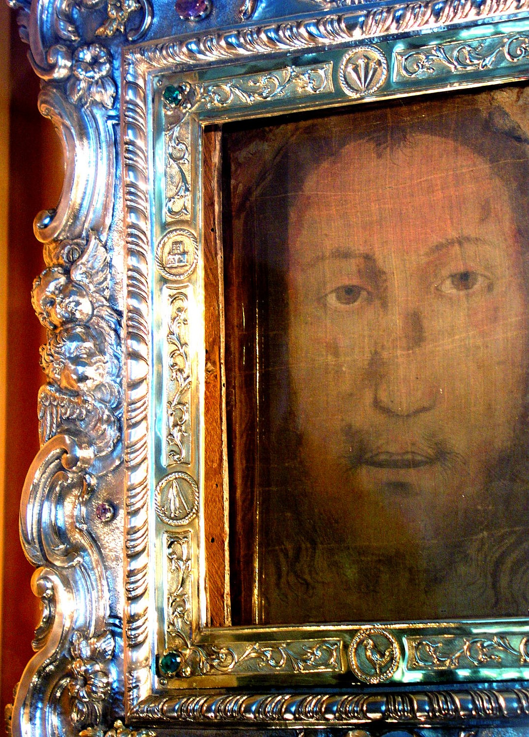 Jak na włoskie możliwości, kościółek średnio urodziwy. Provincial baroc z prostokątną fasadą, wzorowaną na tamtej różowo-białej szachownicy w Santa Maria di Collemaggio, w l’Aquila. Wewnątrz – potrójna nawa z płaskim sufitem w kasetonach, po bokach płaskie kolumny i łuki bez ozdób. Biało, jasno, ale na końcu perspektywy, na tle trzech witraży, tym wyraziściej odznacza się ołtarz z marmuru, podtrzymywany czterema czerwonymi kolumnami. W złoconej prostokątnej monstrancji tkwi tam, między taflami szkła, cienki jak mgiełka bisior z „wtopionym” weń wizerunkiem Najświętszego Oblicza. Technika powstania tego wizerunku jest niewiadoma: wygląda jak grupa cieni naświetlonych na tkaninie w subtelnie różnych od siebie barwach i zagęszczeniach, które jednak tworzą pod pewnymi kątami wyrazistą i znaną dziś wszędzie w świecie Twarz Jezusa, w ostatnich chwilach przed Ukrzyżowaniem.