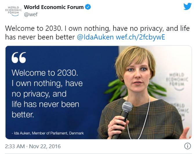 To prawdopodobnie najbardziej dystopijny moment w historii WEF. W 2016 roku Ida Auken, posłanka do parlamentu Danii, powiedziała: