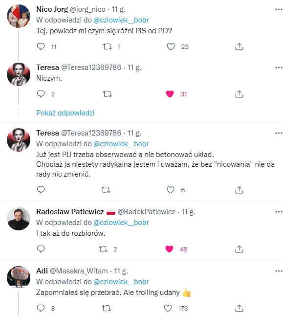 Najbardziej w PiS mnie wkurza, że mimo ich oczywistych wad i błędów, nie ma alternatywy… I znów pojadę na nich zagłosować, znów mnie będą wk…., a ja znów sam sobie będę tłumaczył, że nie było wyjścia, bo za PO byłoby gorzej… @czlowiek__bobr