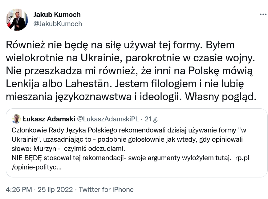 otóż, ku mojej, niekłamanej radości, oznajmił, że nie da się wkręcić w nowomowowe szaleństwo pt. „w Ukrainie”