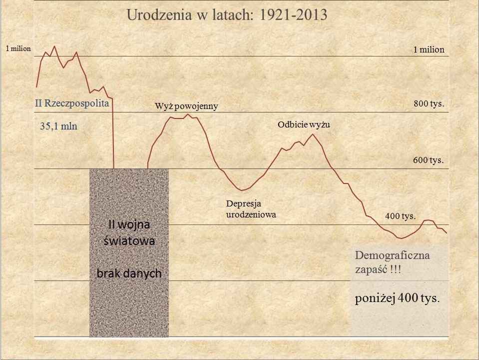 Aby przybliżyć czytelnikowi obraz zmian prezentujemy wykres urodzin w Polsce na przestrzeni ostatnich kilkudziesięciu lat. Spadek z jednego miliona do 331 tys.