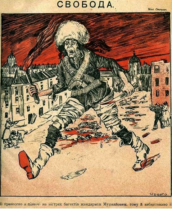 Cała ziemia ukraińska spłynęła męczeńską krwią; płynęła ona po pochyłych ulicach Kijowa, wsiąkała w pszeniczną ziemię wsi, w każdej zaś tliły zgliszcza odwiecznych, dobroczynnych siedzib ludzkich. Noc ukraińska krwawiła niebo bezustannie, — krew była na ziemi i na niebie. Bóg się skrył w chmurach, a ziemia bez Boga oszalała, zalana łzami.