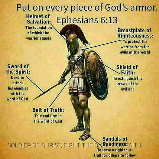 Zbroja rycerza Chrystusa: hełm Zbawienia, puklerz Sprawiedliwości, miecz Ducha (Słowo Boże), tarcza Wiary, pas Prawdy i sandały Gotowości Służenia (Ef, 6: 13)