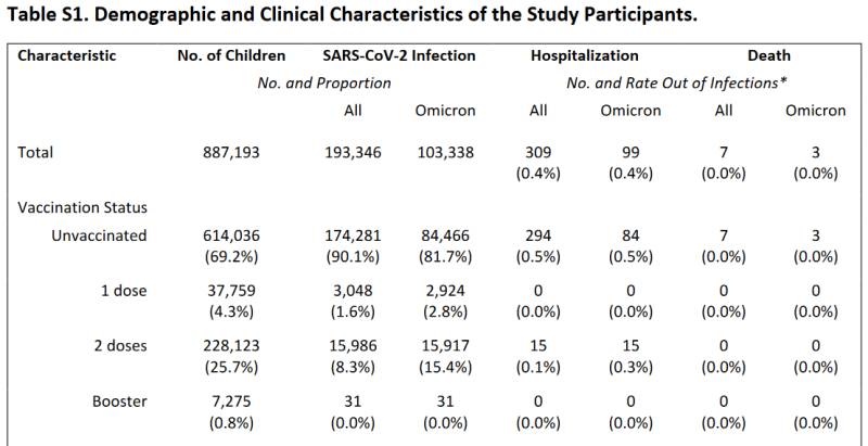 Badanie zostało opublikowane w New England Journal of Medicine (NEJM). Naukowcy dr Lin (et al.) przyjrzeli się 887193 dzieciom w Północnej Karolinie w wieku od 5 do 11 lat „w okresie 6 miesięcy, kiedy dominował wariant omikron”.
