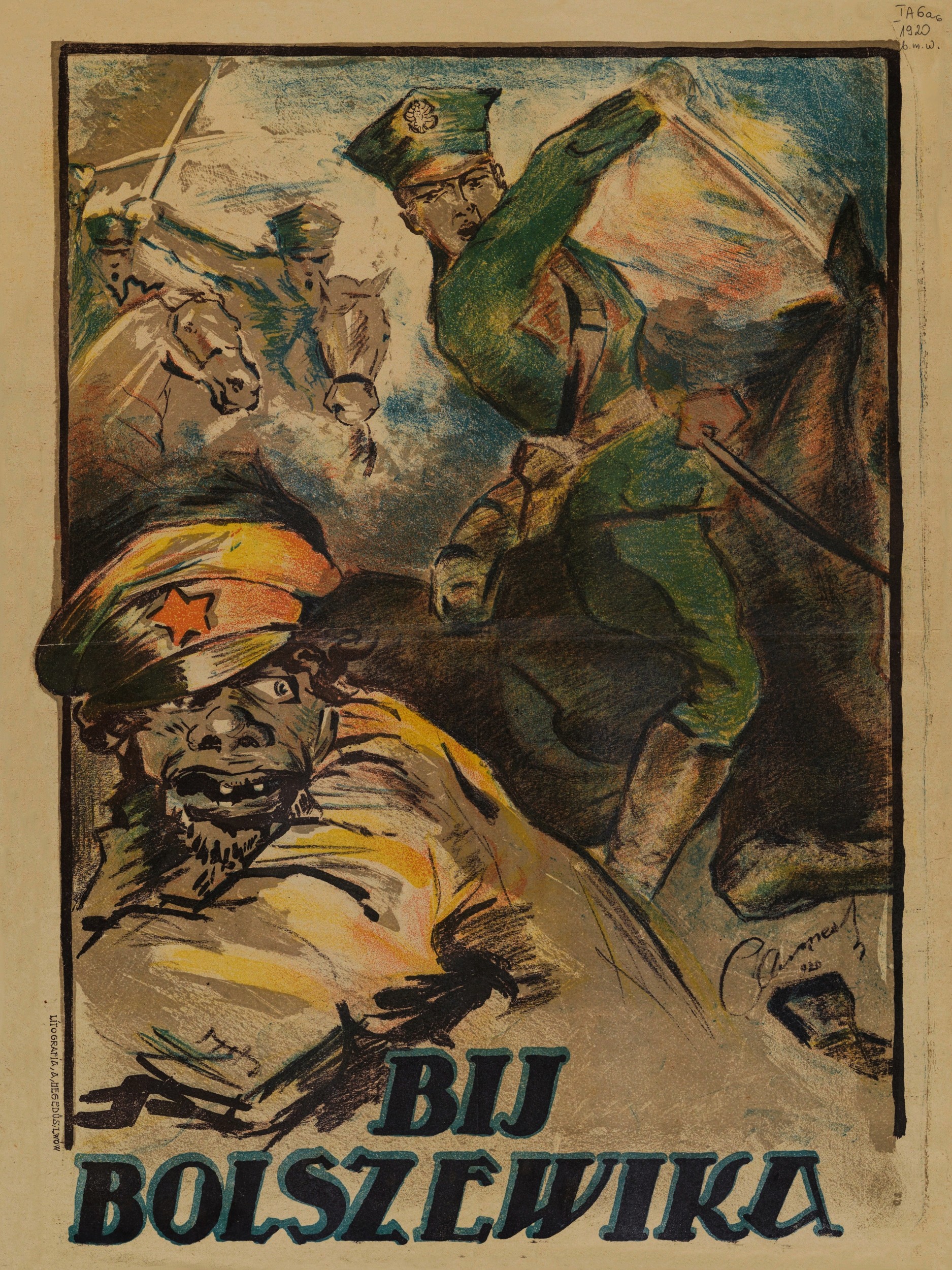 Oryginalny plakat z okresu wojny polsko-bolszewickiej z 1920 r. Widoczna czerwona gwiazda na czapce jewrejo-bolszewika, którego tnie szablą polski ułan.