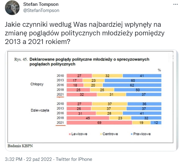 “Sondaż United Surveys dla Wirtualnej Polski został przeprowadzony w dniach 21-23 października 2022 roku na reprezentatywnej grupie tysiąca Polaków”, a więc już po wyborze Sławomira Mentzena na prezesa partii KORWiN. Trudno ocenić w jakim stopniu jego wypowiedź zmniejszyła poparcie wśród dotychczasowych zwolenników, tym bardziej, że podczas poprzednich sondaży Konfederacja nie raz schodziła poniżej progu 5%. Ostatni sondaż został przeprowadzony podobno na “reprezentatywnej grupie tysiąca Polaków”. Bardziej pasowałoby tu określenie grupie obywateli III RP. O progu poczytalności podobnych grup sondażowych świadczy niezmienne poparcie dla antypolskiej lewicy oscylujące na poziomie 80- 90 %. Z tego powodu można zaryzykować stwierdzenie, że bez Mentzena byłoby niewiele lepiej.