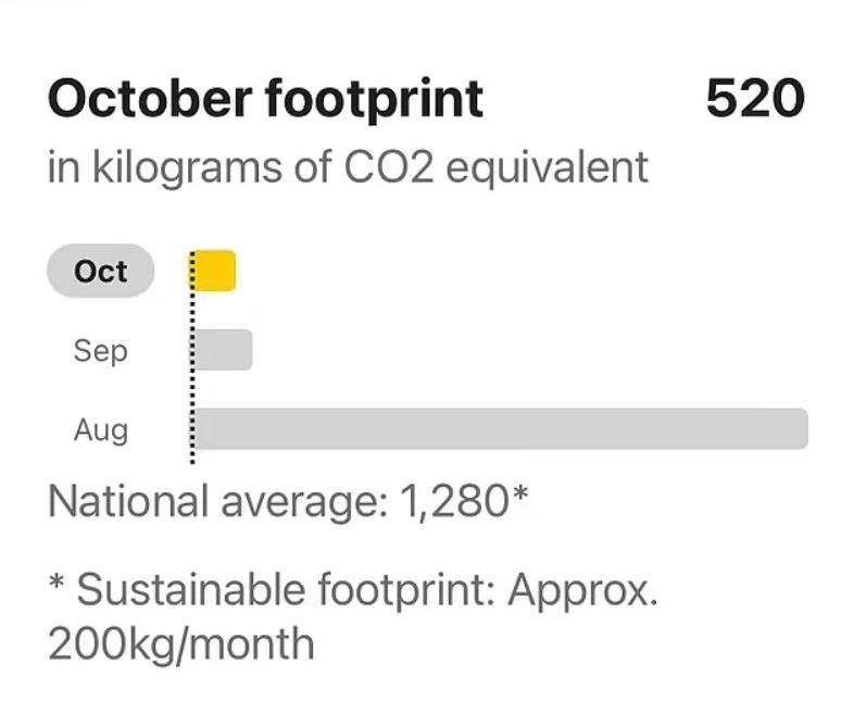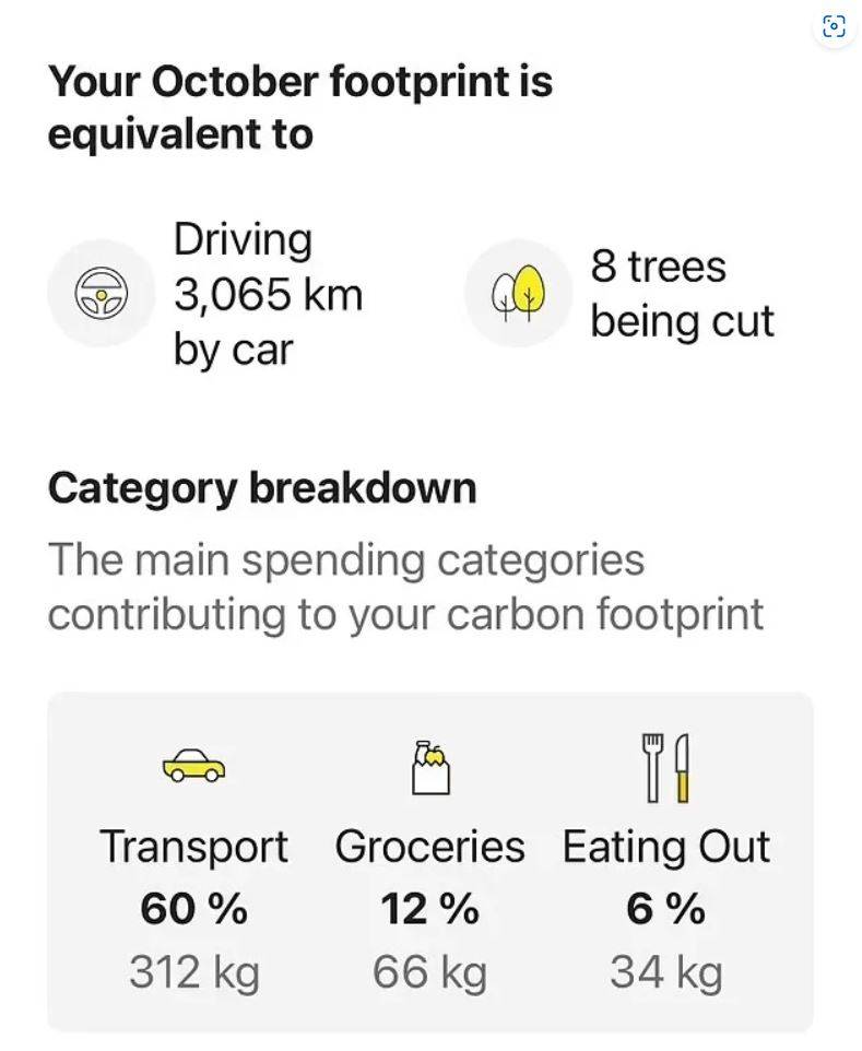 Bank daje klientowi możliwość „uiszczenia opłaty” w celu zrównoważenia swojego śladu węglowego, przy średniej podanej na poziomie 1280 kilogramów, daleko od „zrównoważonej” liczby 200 kilogramów.