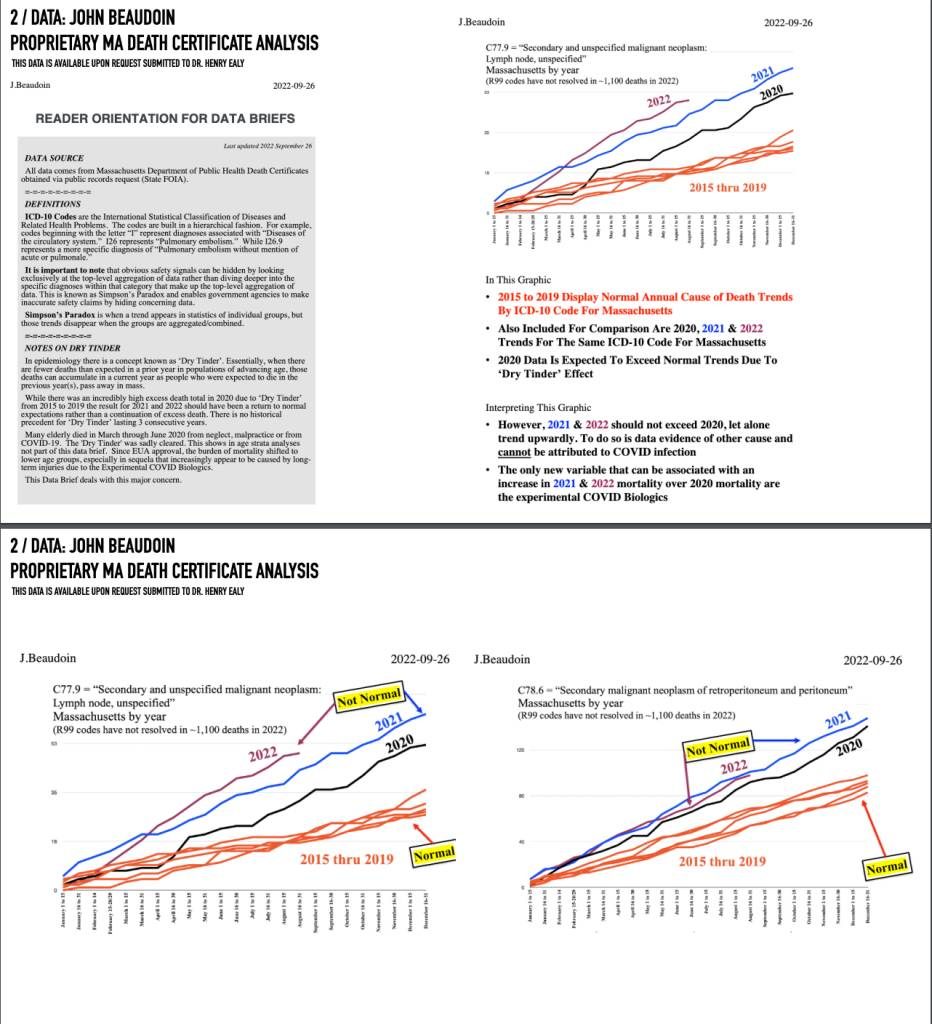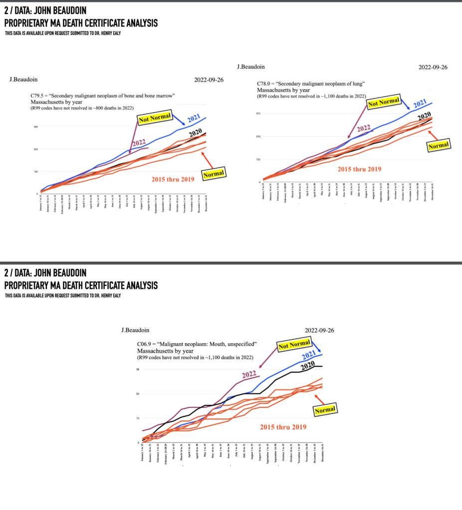 Aby śledzić różne nowotwory złośliwe, Jean Beaudoin przejrzał akty zgonu z Departamentu Zdrowia Publicznego stanu Massachusetts. Jego wykresy wykazywały odchylenia od normy począwszy od 2021r. w porównaniu do lat 2015-2019, począwszy od slajdu 60. Pokazuje również nietypowe guzy w miejscu iniekcji. Niektóre z jego wykresów przedstawiono poniżej: