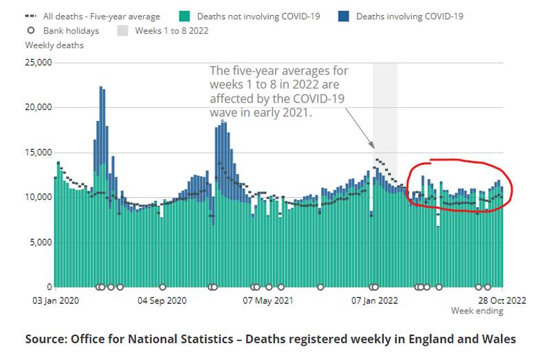 Kryzys związany z nadmierną liczbą zgonów trwa nadal, z 1232 dodatkowymi zgonami – 12,3% powyżej średniej z pięciu lat – zarejestrowanymi w Anglii i Walii w tygodniu kończącym się 28 października, według ONS [Office for National Statistics]. Spośród nich 804 przypisano innej przyczynie niż COVID-19, co daje łączną liczbę zgonów innych niż z powodu covid od początku fali w kwietniu w liczbie 23 287.