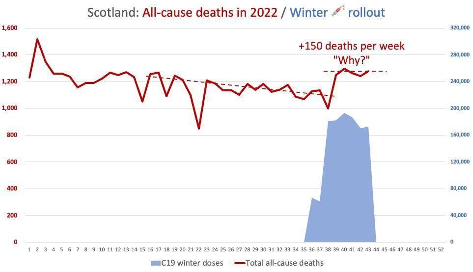 Scottish Unity Edinburgh Group przesłała mi ten wykres pokazujący podobną korelację w Szkocji między zgonami a jesiennym wprowadzeniem boosterów.
