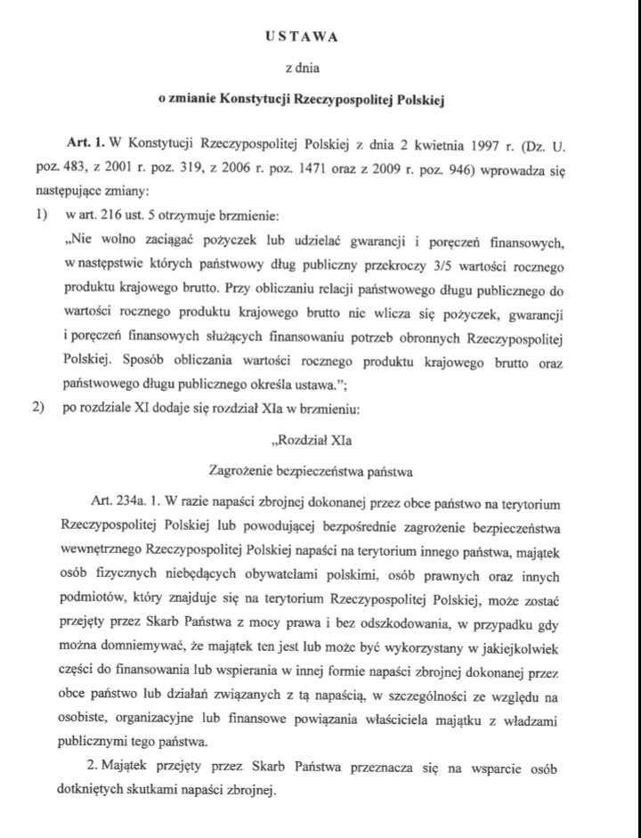 “Nie wolno zaciągać pożyczek lub udzielać gwarancji i poręczeń finansowych, w następstwie których państwowy dług publiczny przekroczy 3/5 wartości rocznego produktu krajowego brutto. Przy obliczaniu relacji państwowego długu publicznego do wartości rocznego produktu krajowego brutto nie wlicza się pożyczek, gwarancji i poręczeń finansowych służących finansowaniu potrzeb obronnych Rzeczypospolitej Polskiej. Sposób obliczania wartości rocznego produktu krajowego brutto oraz państwowego długu publicznego określa ustawa.”